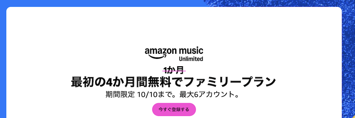 2025年10月10日まで、Amazon Music Unlimitedファミリープラン4か月無料キャンペーン実施中!