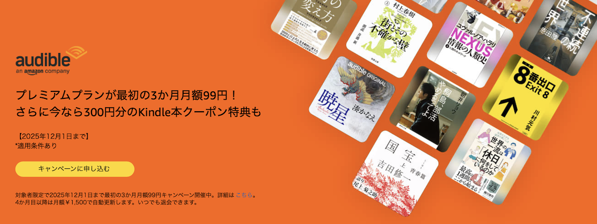 オーディブルでは12月1日(月)まで3ヶ月99円キャンペーン中!