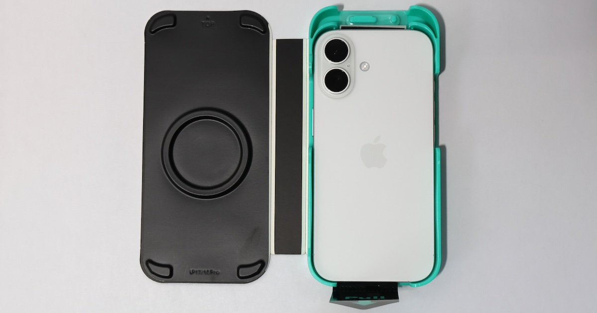 専用の貼り付けトレイにiPhoneを差し込み、タブを引くだけで貼れるという仕組み。
