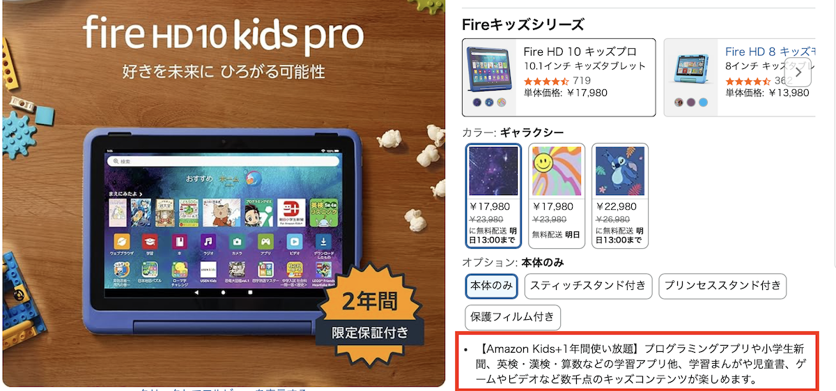 Amazonキッズタブレットは「Amazon Kids+ 1年間」が付帯